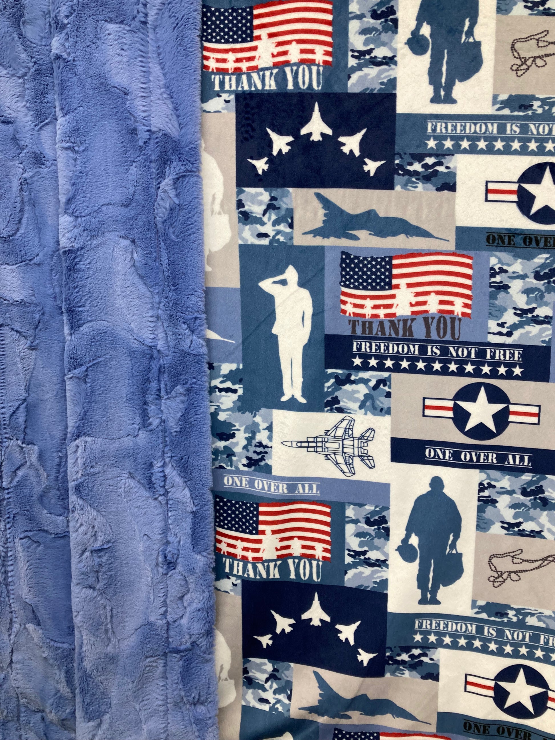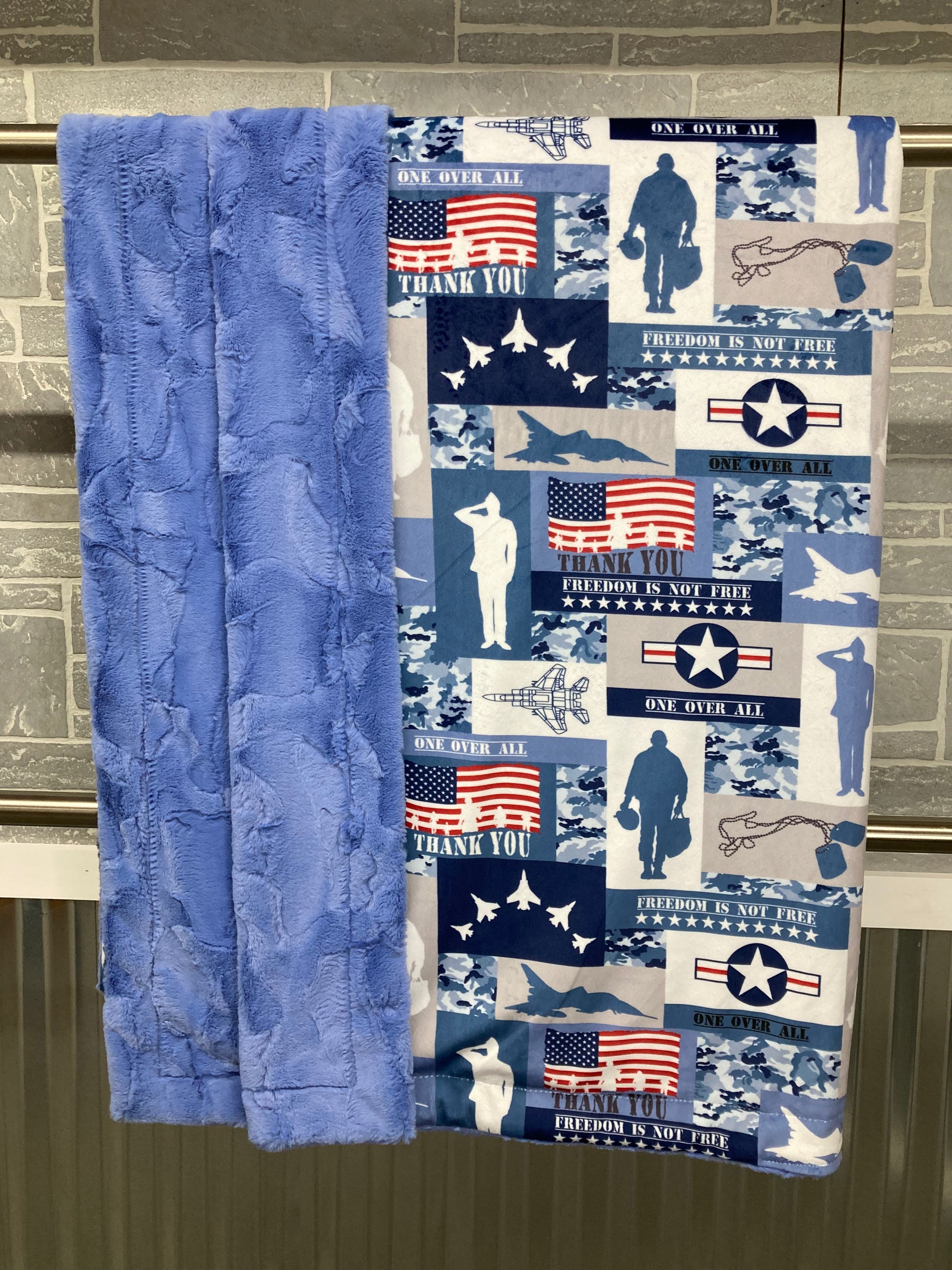 These incredibly soft blankets are made of minky, a synthetic, hypo-allergenic fabric made from 100% polyester fibers. Our blankets are made in the upper peninsula of Michigan and Northern Wisconsin by local seamstresses. They are sized based on pre-sewn fabric and vary slightly in size.